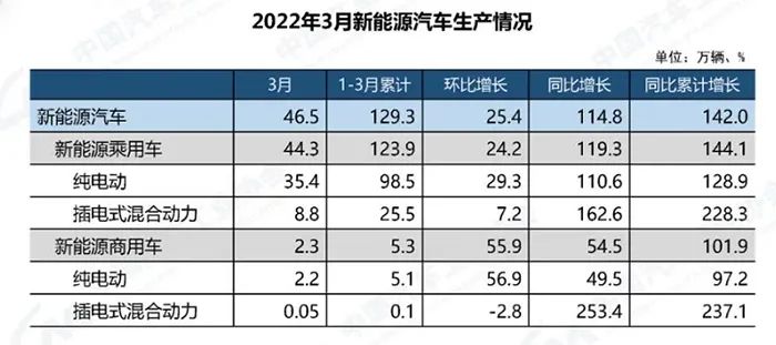 從新能源汽車產(chǎn)業(yè)的產(chǎn)銷數(shù)據(jù)來看,2022年3月,新能源汽車生產(chǎn)完成46.5萬輛,同比增長1.15倍。其中純電動乘用車生產(chǎn)35.4萬輛,同比增長110.6%;插電式混合動力乘用車生產(chǎn)8.8萬輛,環(huán)比增長7.2%;純電動商用車生產(chǎn)2.2萬輛,同比增長49.5%;插電式混合動力商用車生產(chǎn)0.05萬輛,同比增長253.4%。