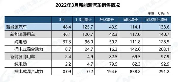 3月,新能源汽車銷售完成48.4萬輛,同比增長1.14倍。其中純電動乘用車銷售完成37.3萬輛,同比增長111.8%;插電式混合動力乘用車銷售完成8.7萬輛,同比增長142.6%;純電動商用車銷售完成2.2萬輛,同比增長62.3%;插電式混合動力商用車銷售完成0.09萬輛,同比增長858.2%。