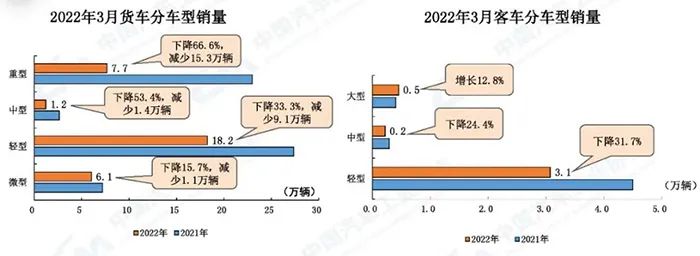 從細(xì)分車型來看,2022年3月,商用車產(chǎn)銷分別完成36萬輛和37萬輛,同比分別下降38%和43.5%。其中,3月重型貨車銷7.7萬輛,中型貨車銷1.2萬輛,輕型貨車銷18.2萬輛,微型貨車銷6.1萬輛。四類貨車同比呈不同程度下降,重型貨車降幅最為明顯,同比下降66.6%。