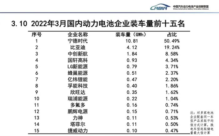 2022年1-3月國內(nèi)動力電池企業(yè)裝車量前十名分別是:寧德時代、比亞迪、中創(chuàng)新航、國軒高科、蜂巢能源、LG能源、億緯鋰能、孚能科技、欣旺達(dá)、捷威動力。