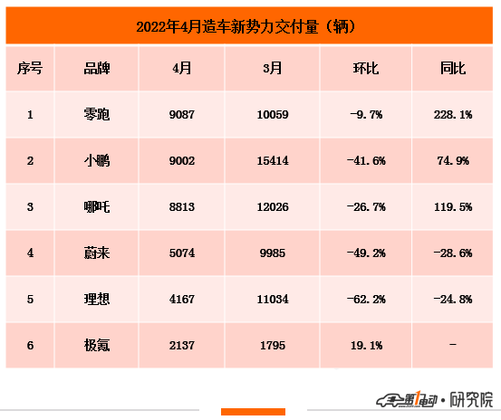 5月1日下午,在我們焦急地等待下,極氪、哪吒、蔚來(lái)、理想、小鵬、零跑陸續(xù)發(fā)布了4月交付量。4月,零跑汽車(chē)交付量9,087輛,環(huán)比微降9.7%,超越“蔚小理哪”首奪冠軍,小鵬汽車(chē)交付9,002輛,奪得亞軍,哪吒汽車(chē)交付8,813輛,獲得季軍。蔚來(lái)汽車(chē)交付5,074輛,排名上升一位至第四,理想汽車(chē)交付4,174輛,排名嚴(yán)重下滑,從3月第三下降至4月第五。環(huán)比來(lái)看,理想汽車(chē)下降最嚴(yán)重達(dá)62.2%,其次是蔚來(lái)汽車(chē)下降49%,小鵬下降41.6%,哪吒汽車(chē)下降26.7%,零跑汽車(chē)微降9.7%。極氪汽車(chē)是新勢(shì)力唯一逆勢(shì)增長(zhǎng)的企業(yè),環(huán)比上漲19%。同比來(lái)看,零跑汽車(chē)暴漲228%,哪吒汽車(chē)大漲近120%,小鵬汽車(chē)上漲74.9%,而理想和蔚來(lái)下降超20%。此外,廣汽埃安4月銷(xiāo)量10,212輛,同比增長(zhǎng)23%,1-4月累計(jì)銷(xiāo)量55,086輛,同比增長(zhǎng)113%;合創(chuàng)汽車(chē)公布了4月的訂單量,3,084輛,同比增長(zhǎng)6500%,環(huán)比增長(zhǎng)2.3%,未公布交付量。